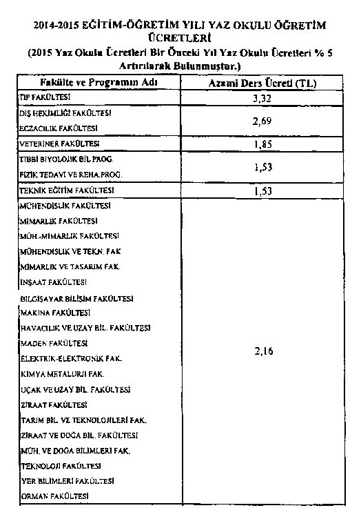 2015 yaz okulu ucretleri firat pamukkale istanbul tunceli kocaeli uni universite