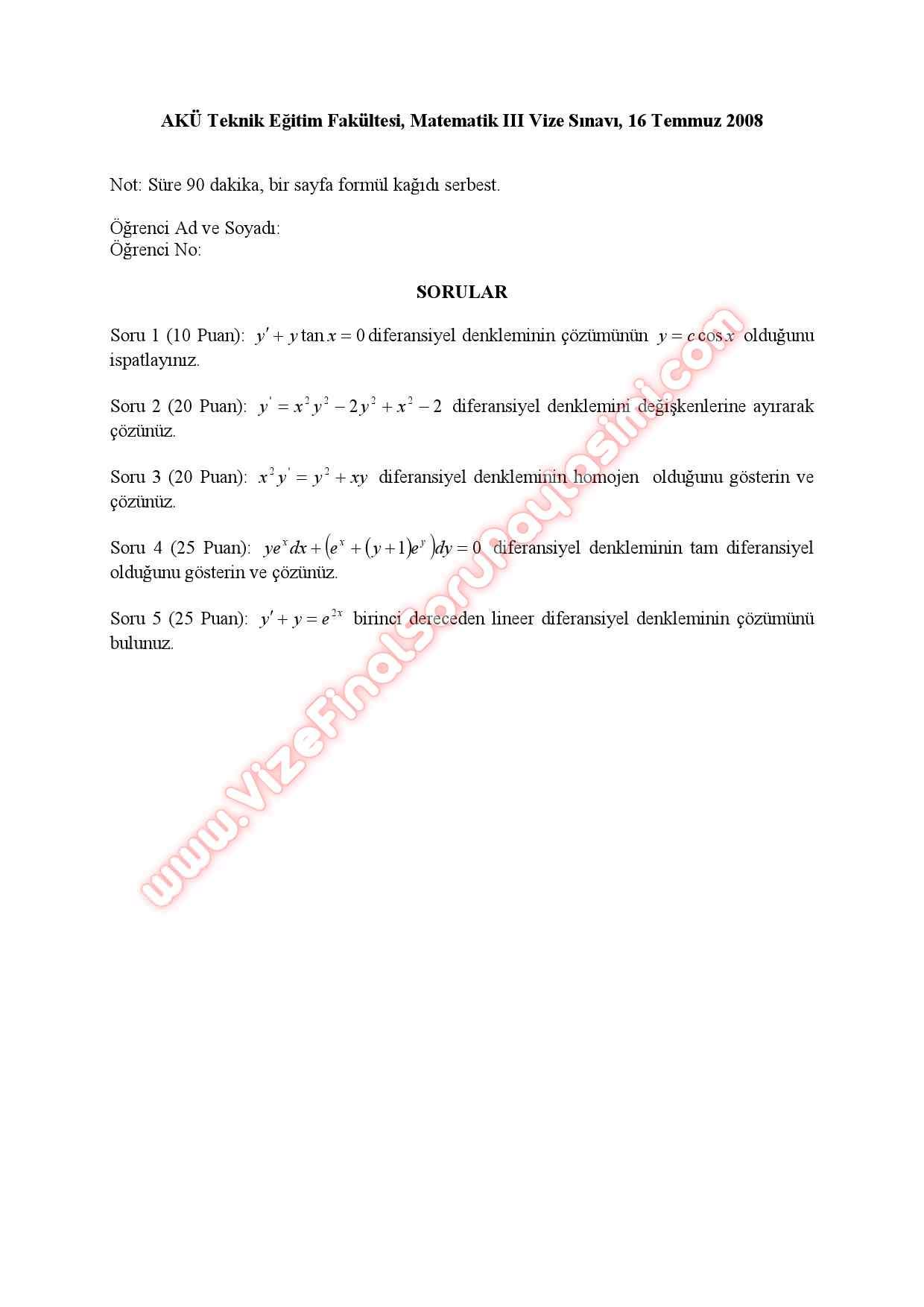 Matematik 3 Yaz Okulu Vize Soruları -2008