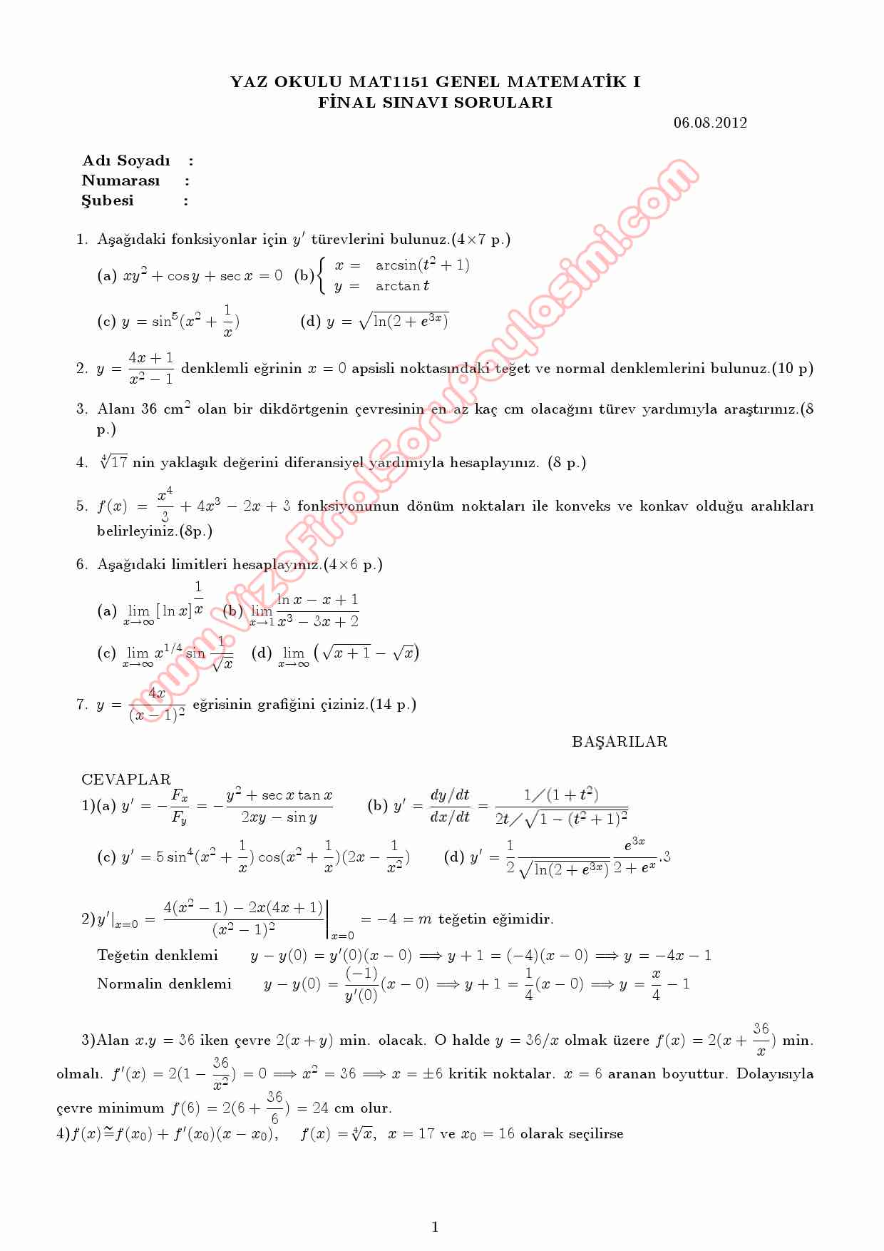 genel matematik-1 matematik1 final sorulari cozumleri cevaplari cumhuriyet uni universitesi GERİ DÖN-