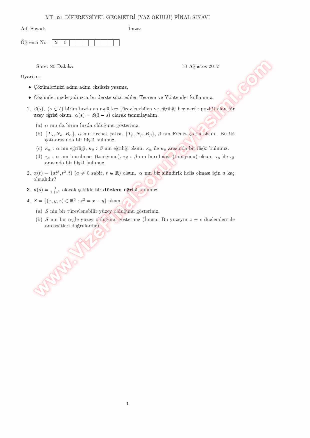 Diferansiyel Geometri yaz okulu final sorulari 2012