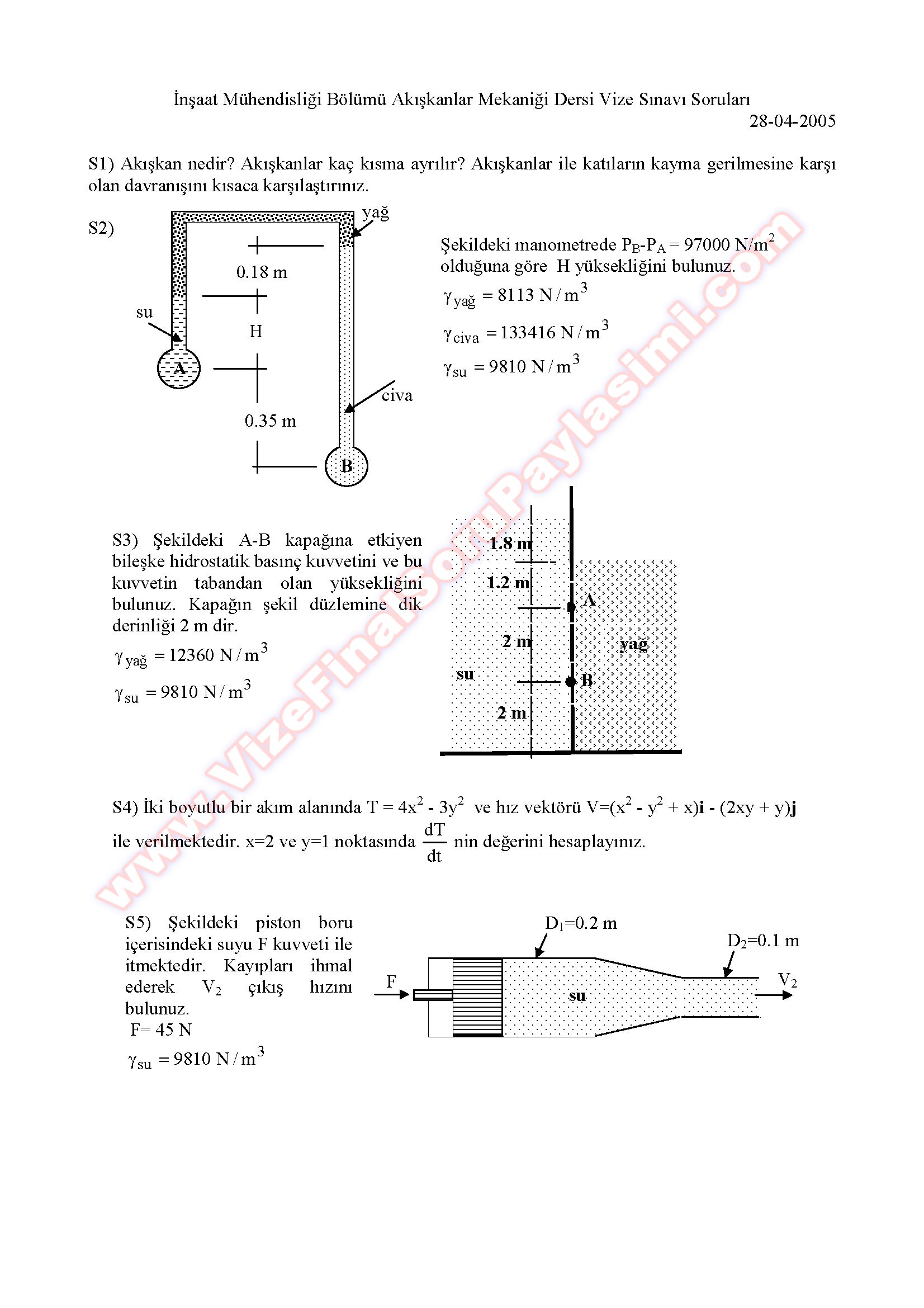 Akışkanlar Mekaniği Vize Soruları ve Cevapları - 28.04.2005