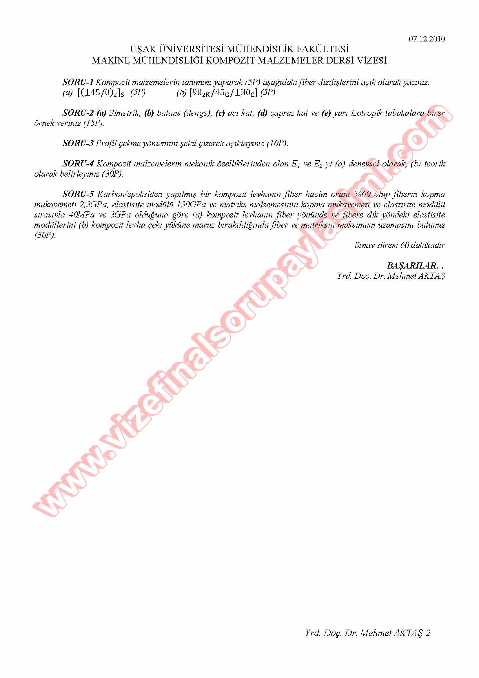 Vize ve Final Soruları / Uşak Üniversitesi / Kompozit Malzemeler Dersi