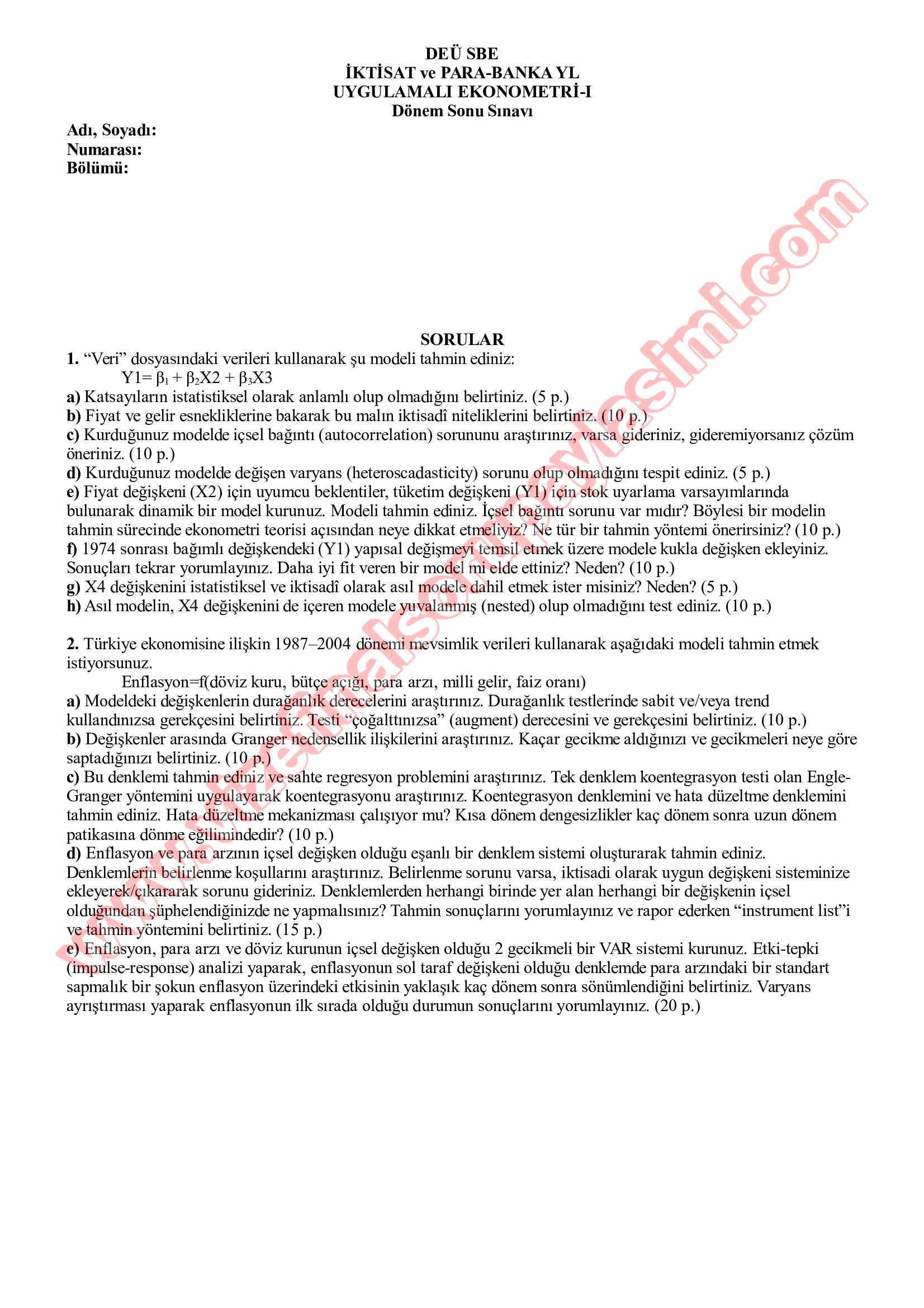Vize ve Final Soruları / Dokuz Eylül Üniversitesi / Uygulamalı Ekonometri -1
