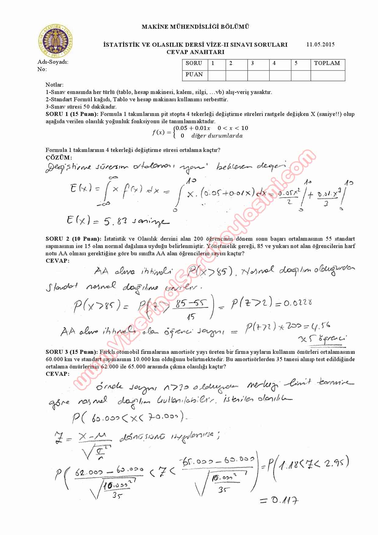 İstatistik ve Olasılık Dersi 2.Vize Soruları ve Cevapları
