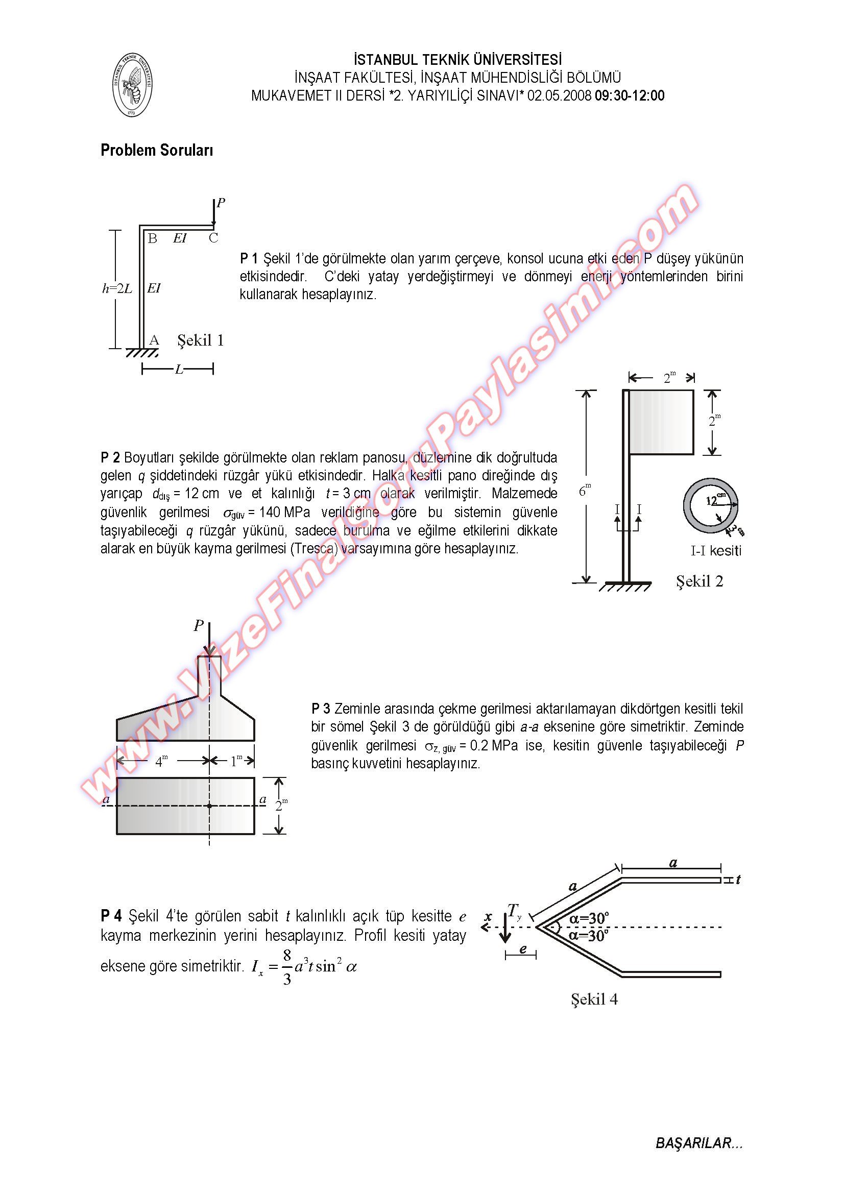 Mukavemet-2-Dersi 2. Yarıyıl Sınavı Soruları - 02.05.2008