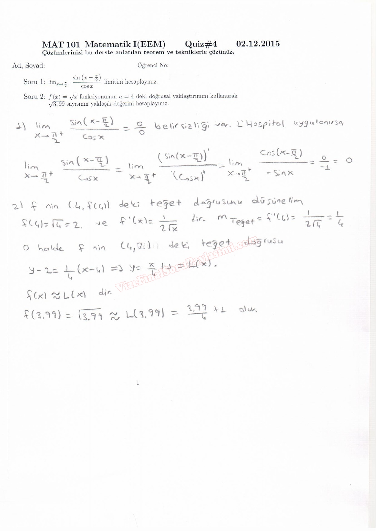 Matematik -1 2. Quiz Soru ve Çözümleri - EEM 17-12-2015, 16:20