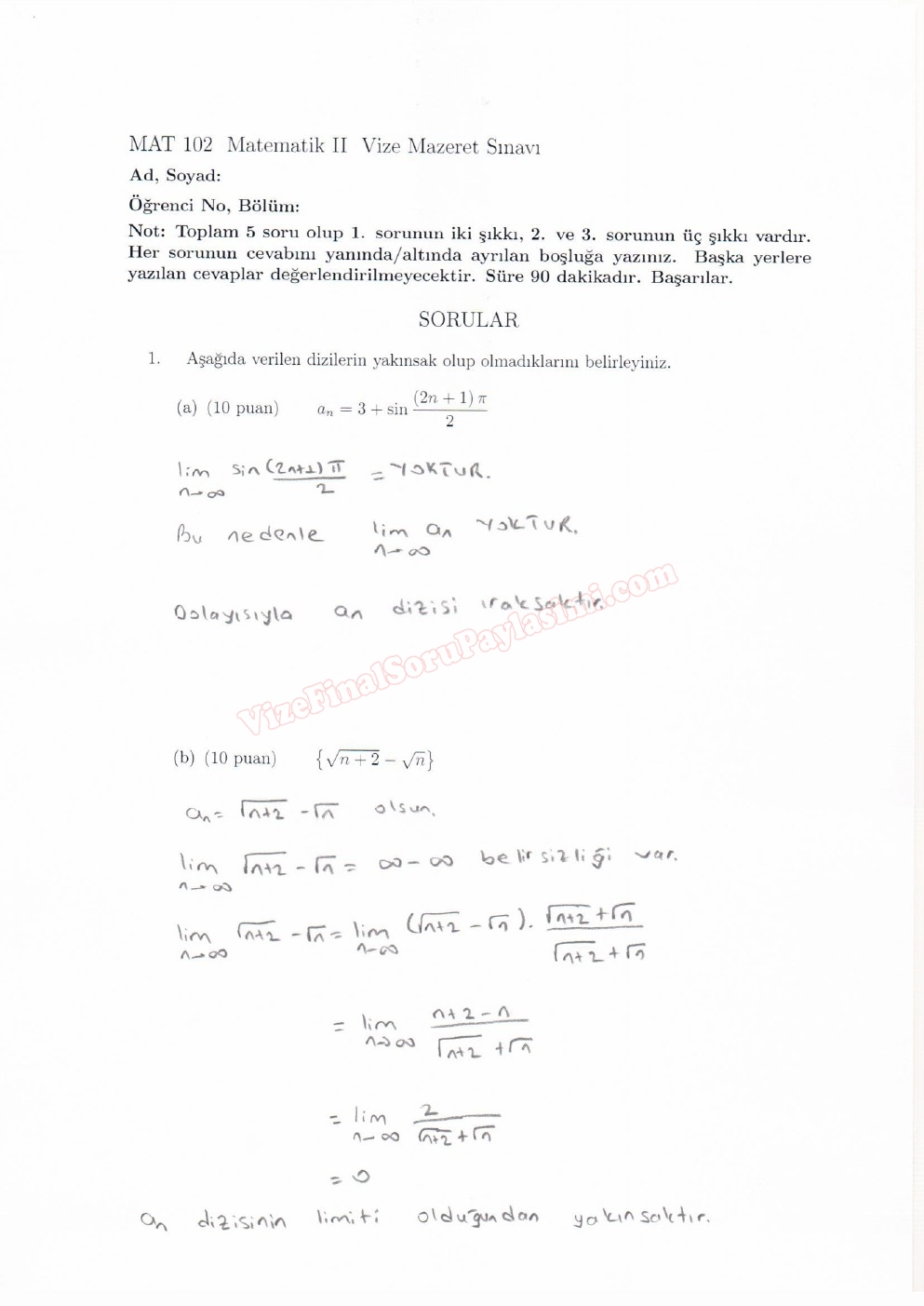 Vize ve Final Soruları / Melikşah Üniversitesi / Matematik -2