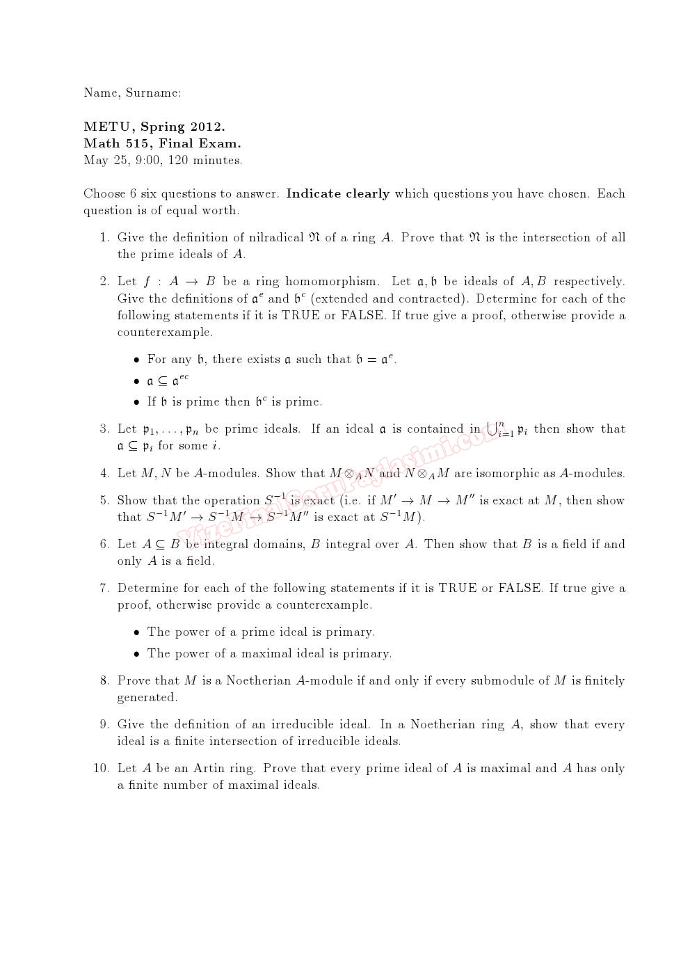 Commutative Algebra Final Questions ODTU