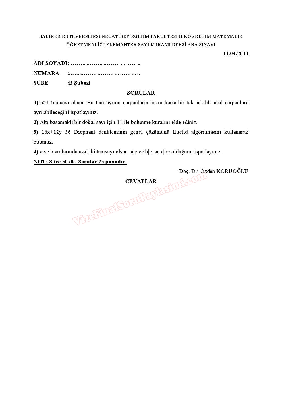 Elemanter Sayı Kuramı vize soruları Balıkesir Üniversitesi