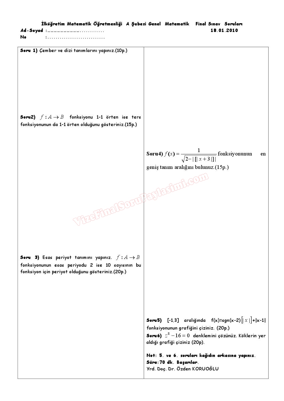 Genel Matematik Dersi Final Soruları 16-11-2015, 01:50