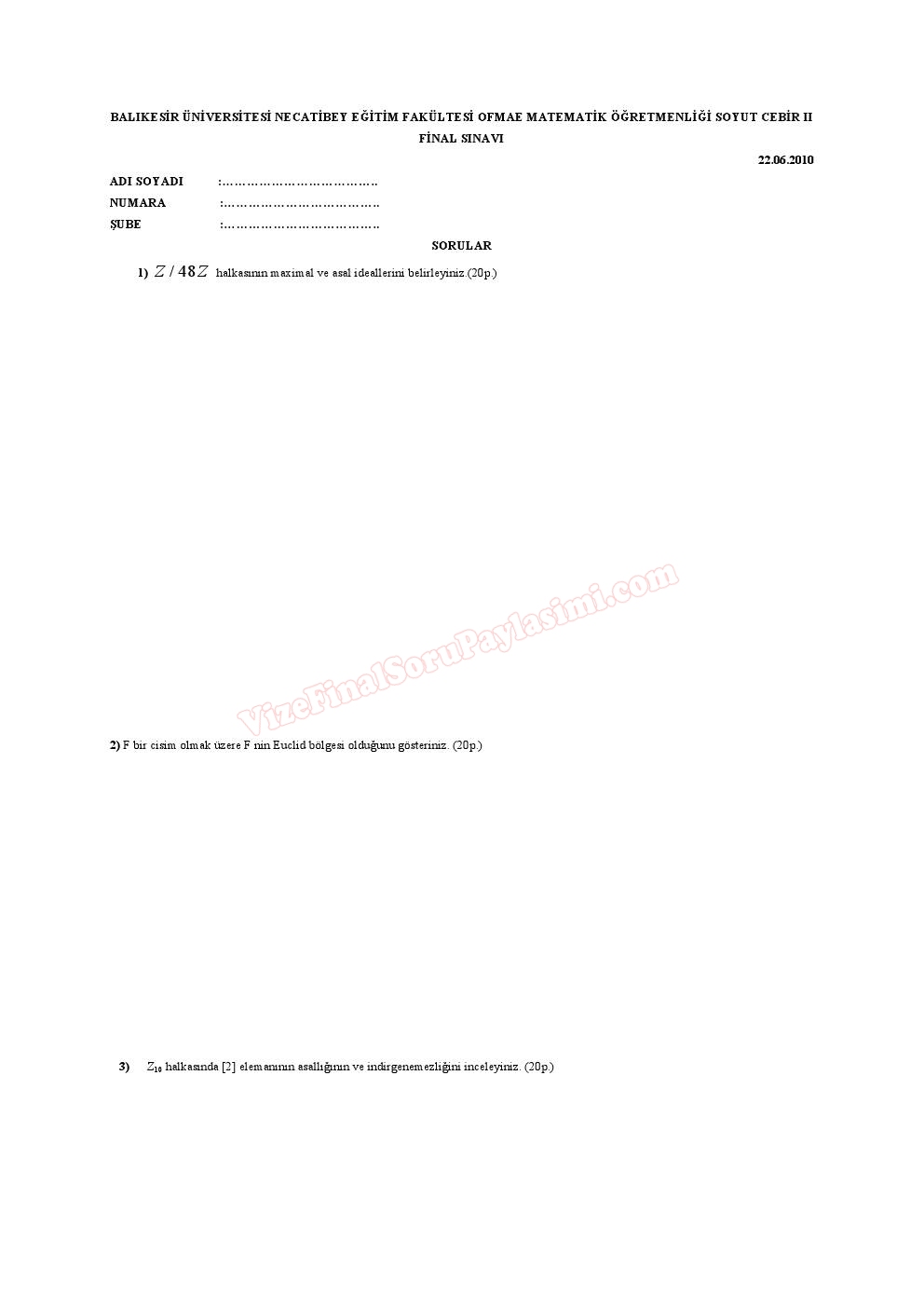 Soyut Cebir 2 Final Soruları 2010
