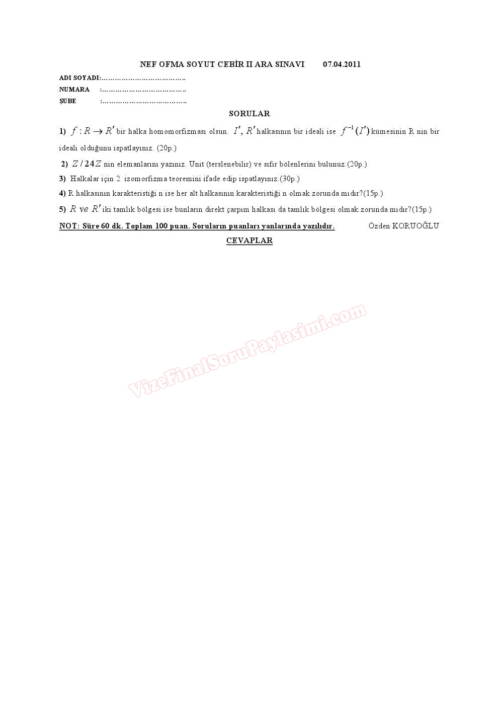 Soyut Cebir Ve Sayılar Teorisi Vize Soruları Ve Cevapları 13-05-2015, 12:59