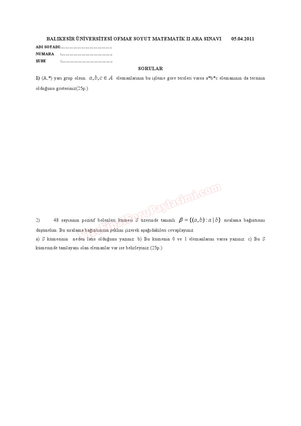 Soyut Matematik 2 Vize Soruları 2011