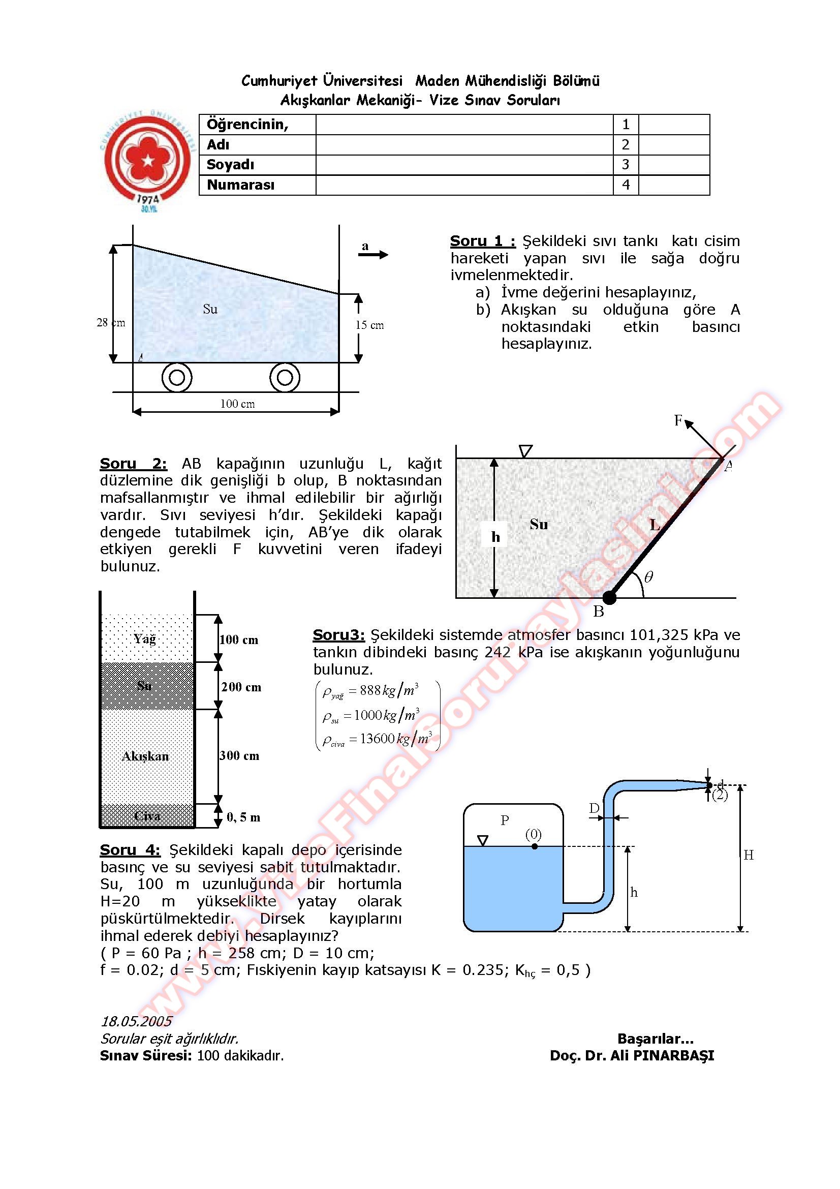 Akışkanlar Mekaniği Vize soruları 18.05.2005