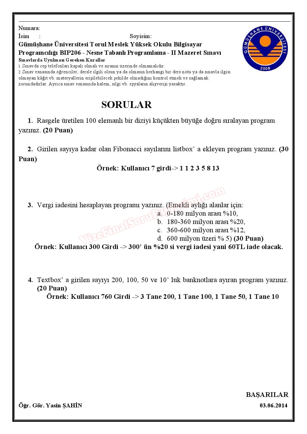 Vize ve Final Soruları / Gümüşhane Üniversitesi / Nesne Tabanlı Programlama –2