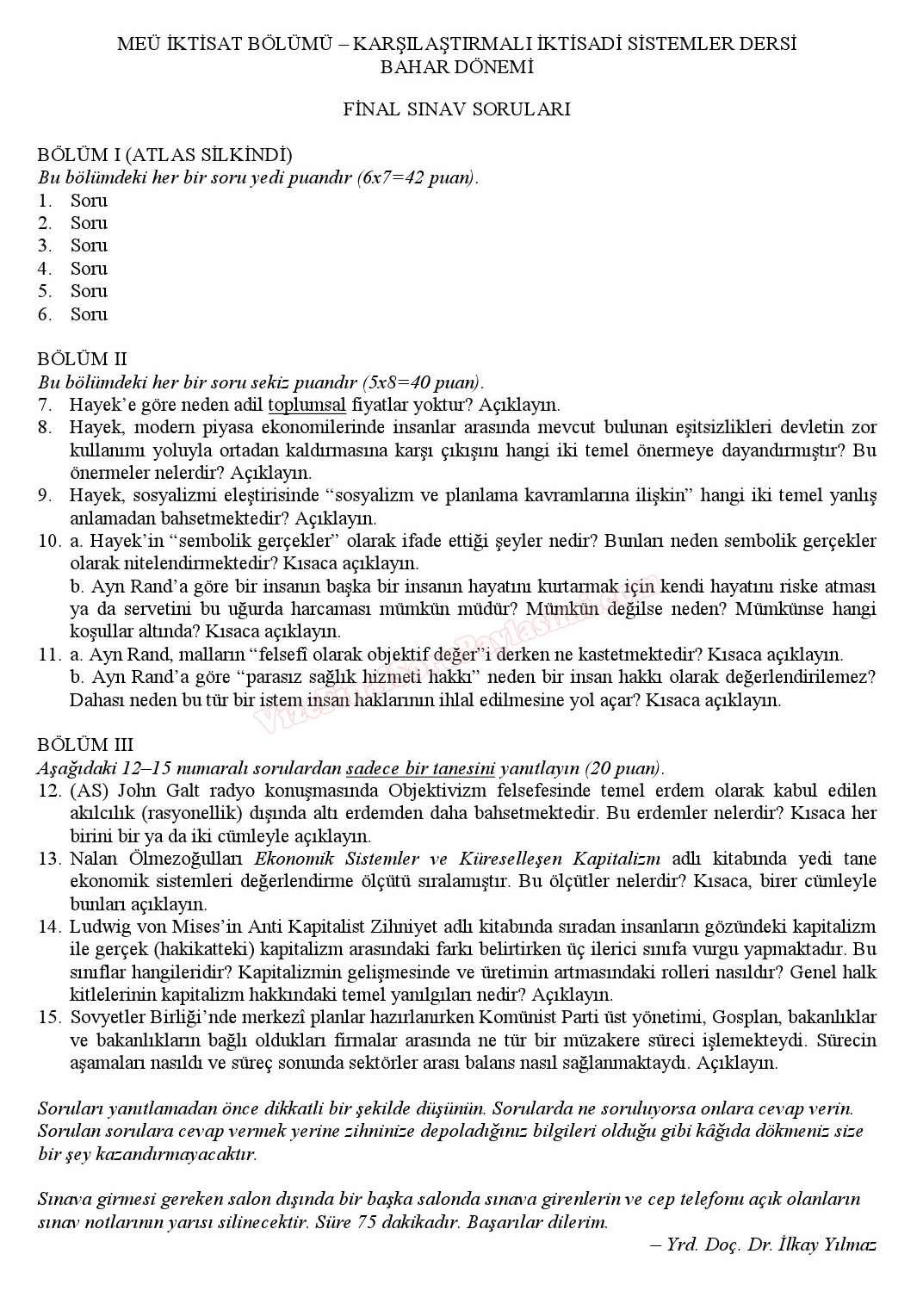 Karşılaştırmalı İktisadi Sistemler Dersi Final Soruları Mersin Üniversitesi