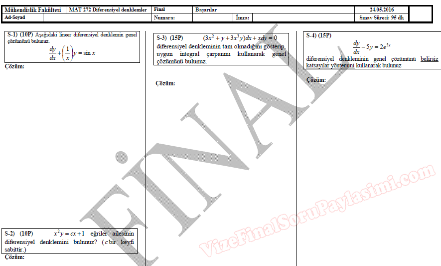 Vize ve Final Soruları / Fırat Üniversitesi / Diferansiyel Denklemler