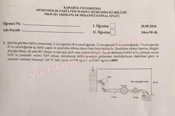 Vize ve Final Soruları / Karabük Üniversitesi / Akışkanlar Mekaniği-2