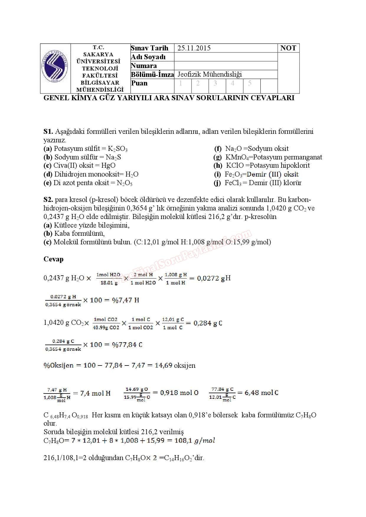 Sakarya Üniversitesi Genel Kimya Dersi vize soruları cevaplari Jeofizik Mühendisliği GERİ DÖN-