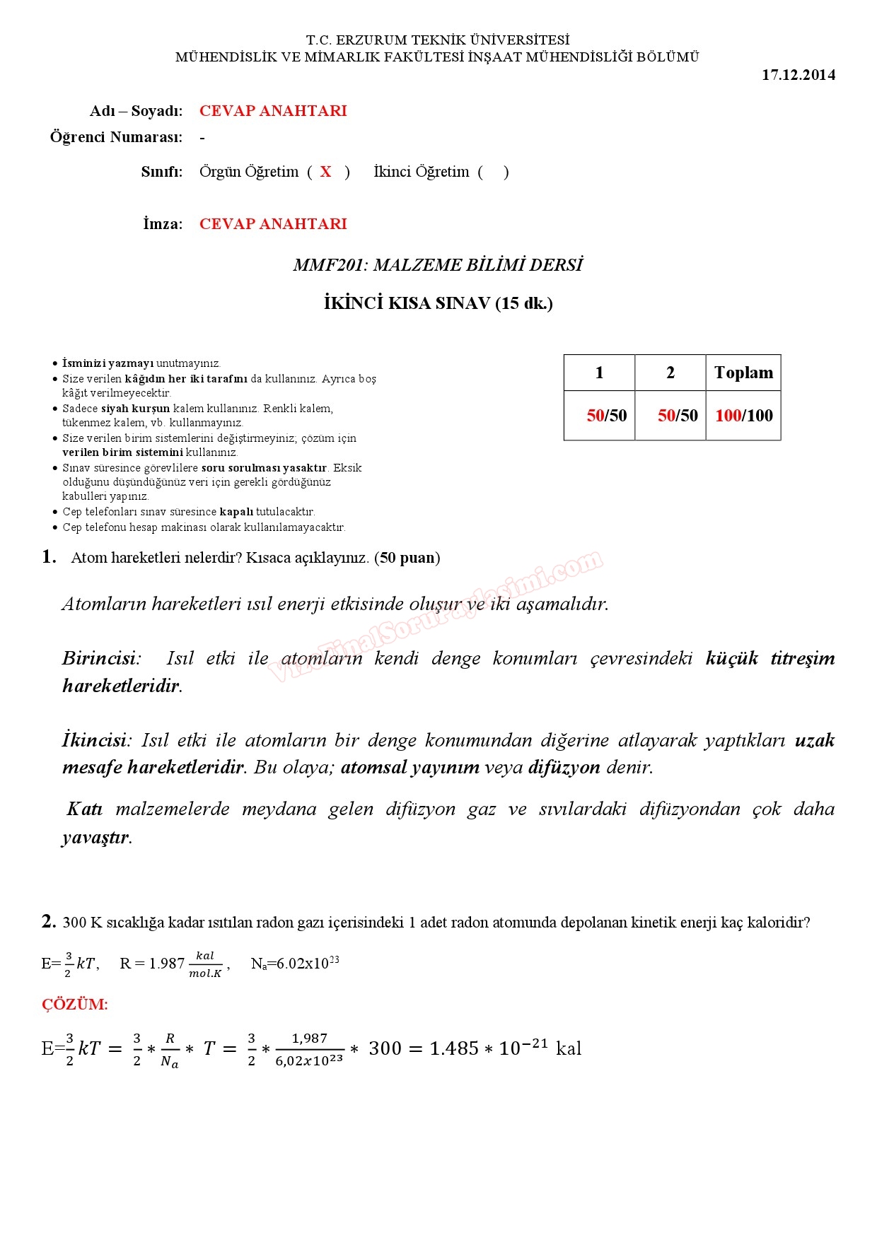 Malzeme Bilimi 1.Kısa Sınav Soruları ve Cevapları 2.Öğretim 29-11-2016, 01:16