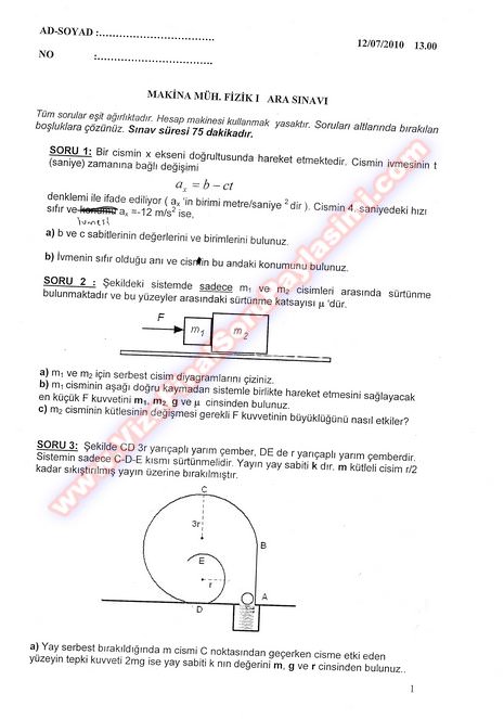 Fizik 1 Vize Soruları - 12.07.2010