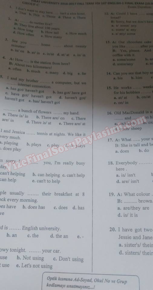 ingilizce final sorulari test 2017 Fırat Üniversitesi