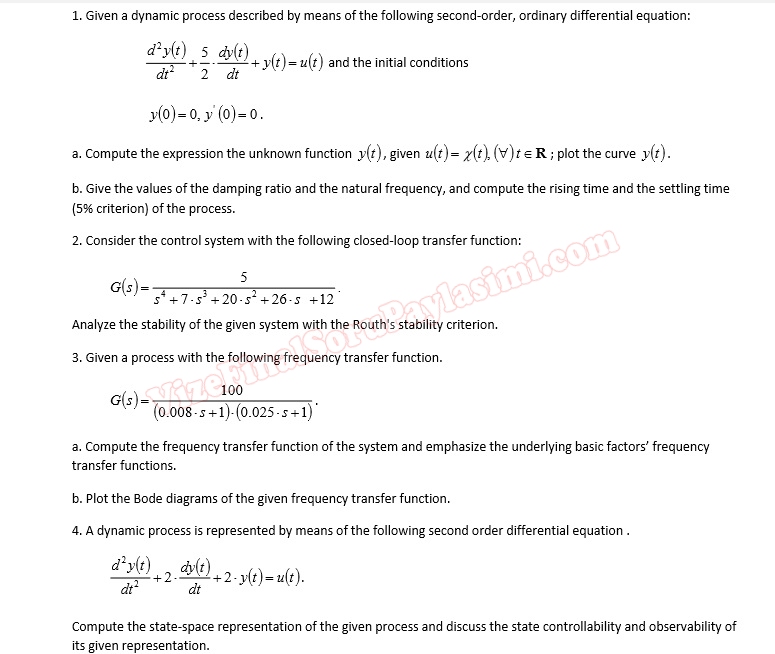 4)bir dinamik proses aşağıda verilen ikinci dereceden bir diferansiyel denklem ile tanımlanmıştır.Buna göre durum-uzay ifadesini bulunuz,kontrol edilebilirlik,gözlenebilirlik hakkında yorum yapınız.