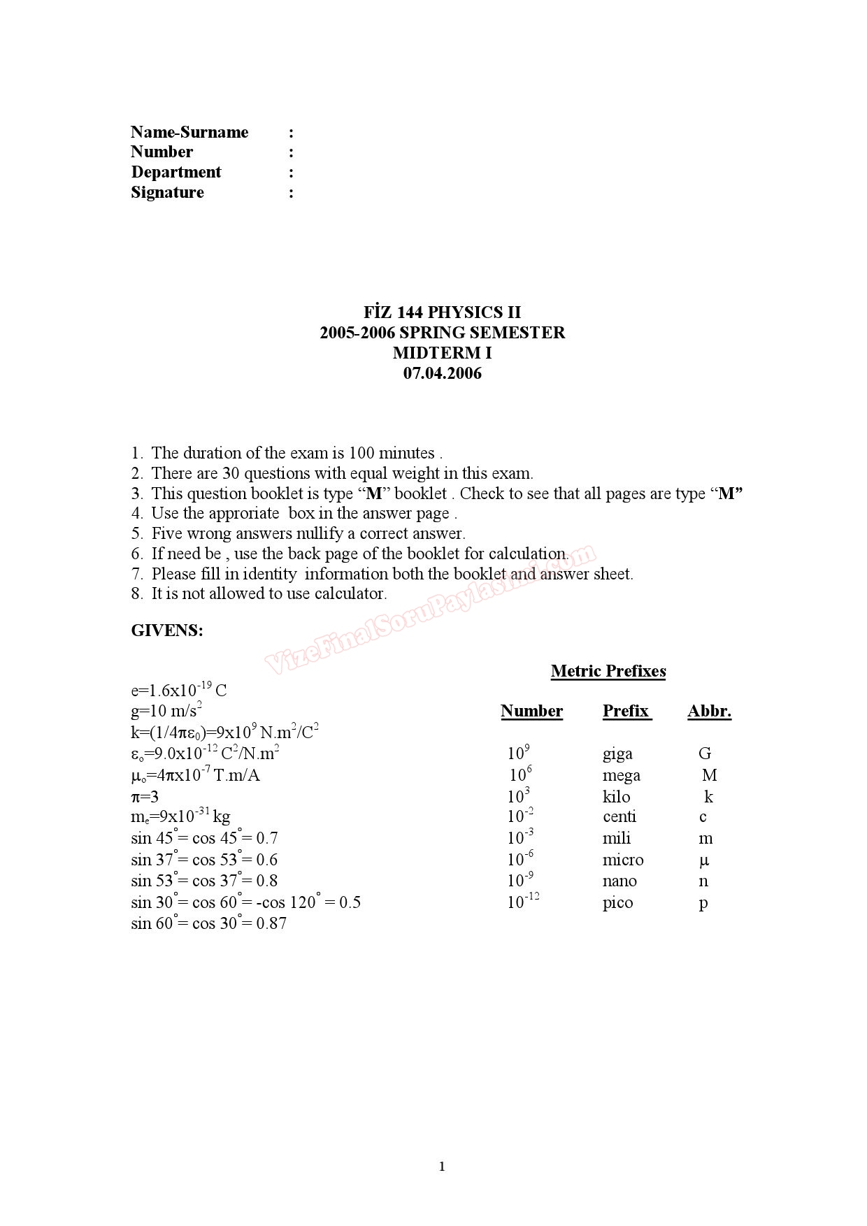 Physics - 2 Spring Semester Midterm - 1 Questions 11-04-2017, 19:02