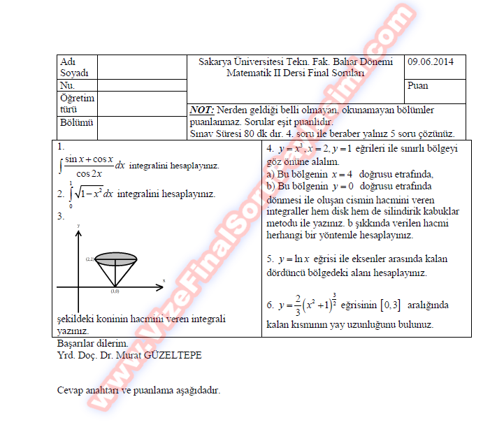 Matematik-2 Final Soruları Ve Cevapları - 09.06.2014