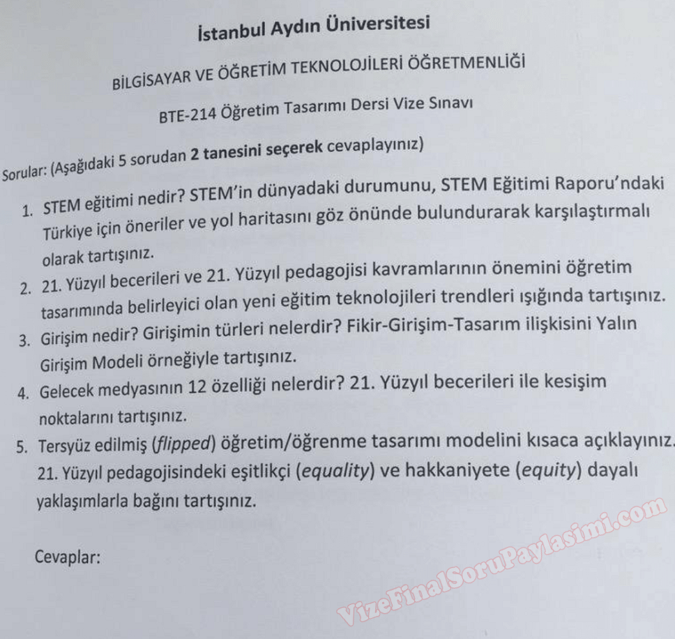 Vize ve Final Soruları / İstanbul Aydın Üniversitesi / Öğretim Tasarımı