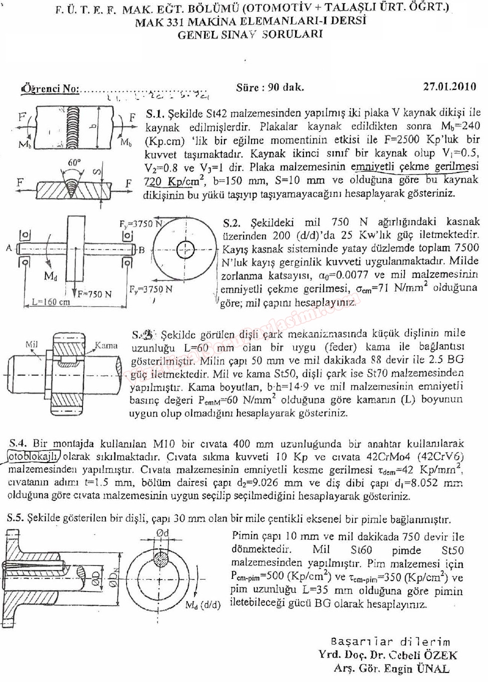 Makina Elemanları -1 Genel Sınav Soruları Final Soruları 2010 Fırat Üniversitesi GERİ DÖN-