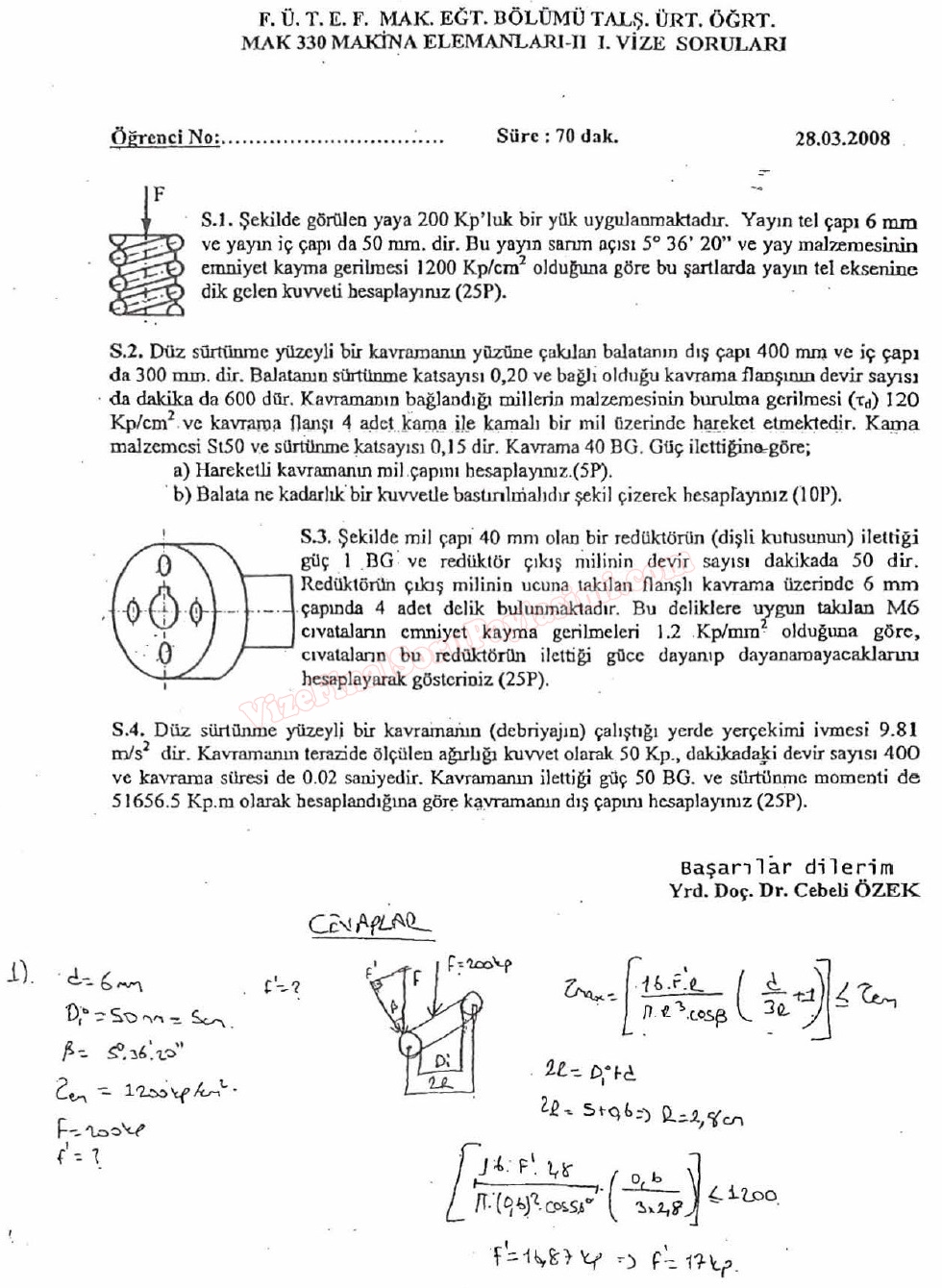 Makina Elemanları -2 Vize Soruları Arasınav Soruları 2008 Fırat Üniversitesi fu