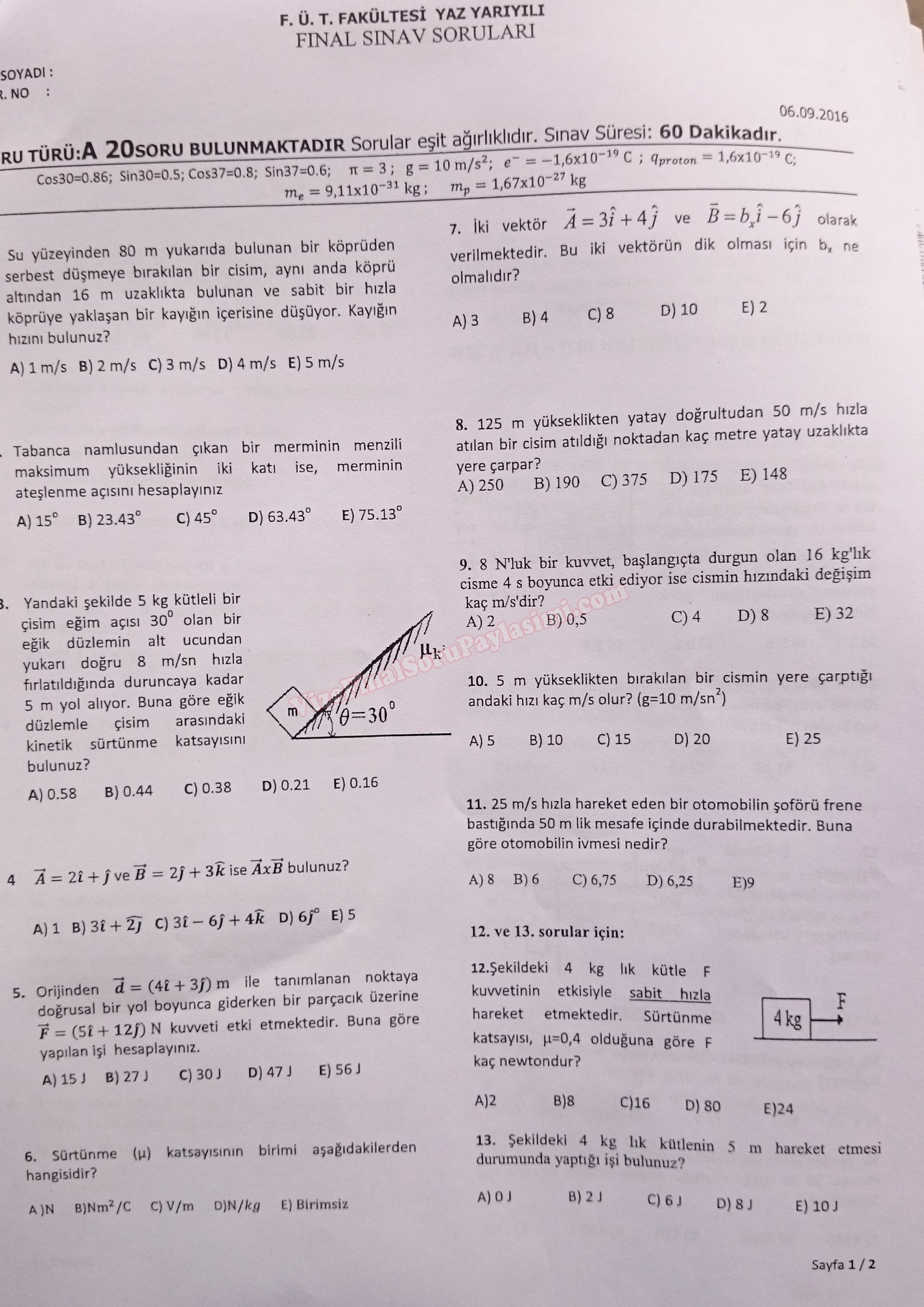 Fizik -1 fizik 1 genel sınav final soruları fırat üniversitesi test soruları GERİ DÖN-