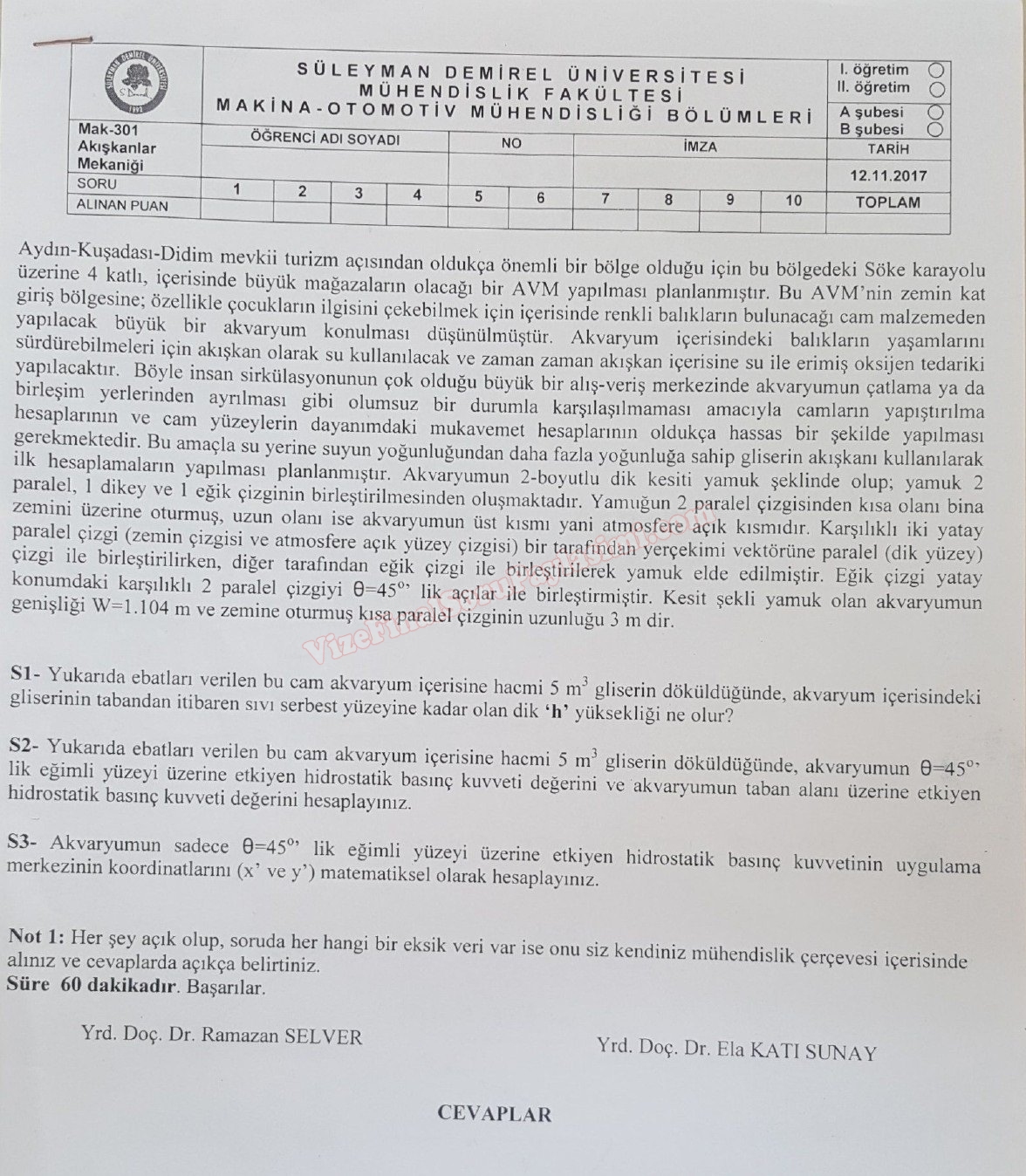 Vize ve Final Soruları / Süleyman Demirel Üniversitesi / Akışkanlar Mekaniği Dersi