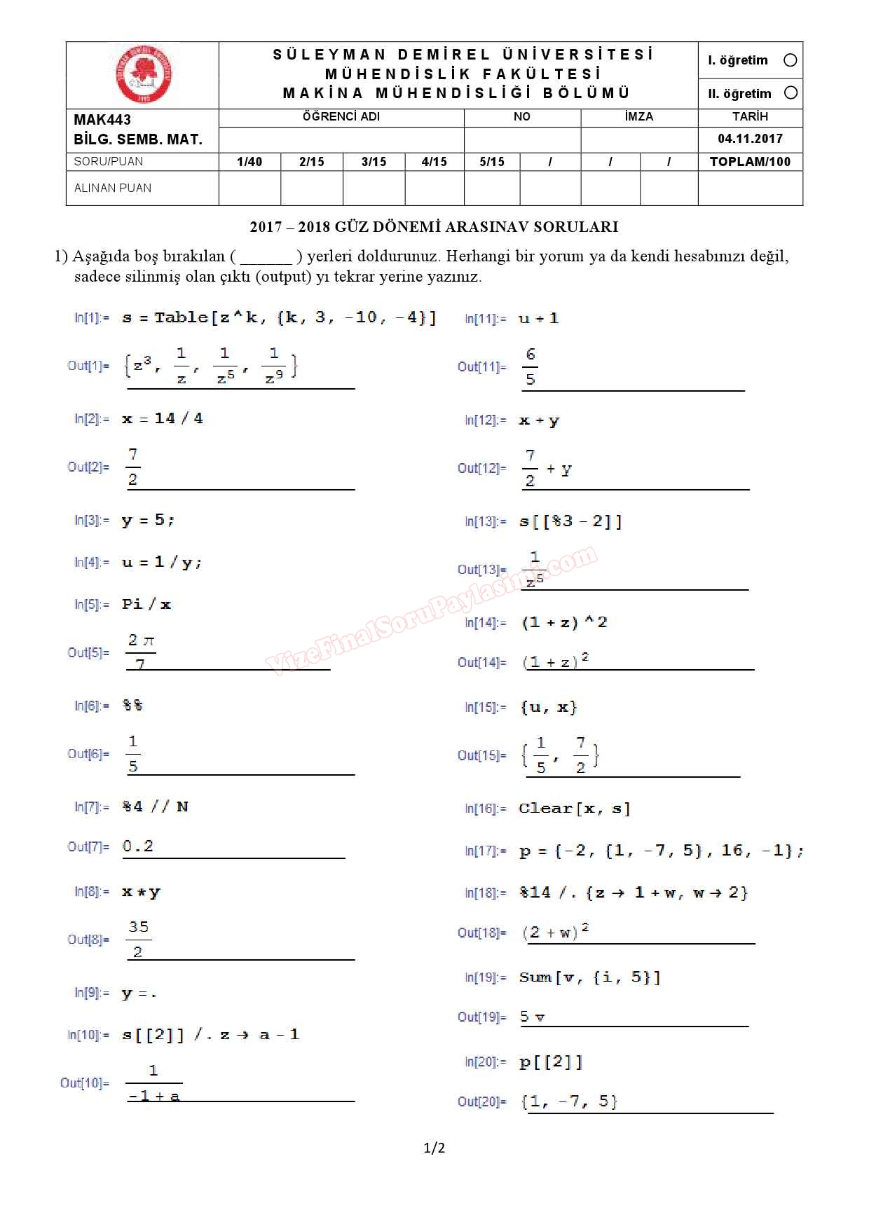 Süleyman Demirel Üniversitesi sdu cevapları bil des sembolik matematik vize soruları GERİ DÖN-
