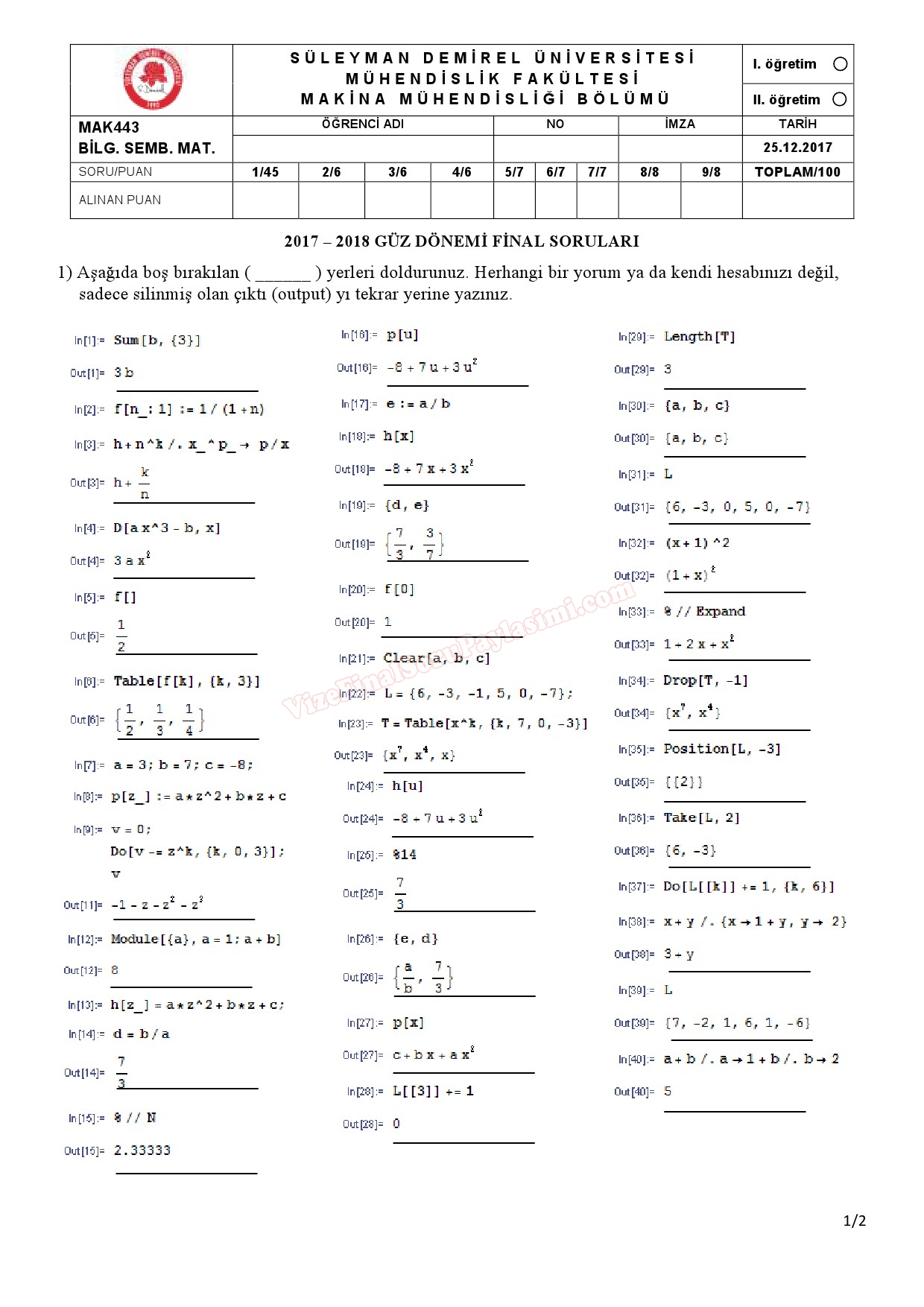 sdu Süleyman Demirel Üniversitesi sınav bil. des. sembolik matematik final soruları cevapları GERİ DÖN-