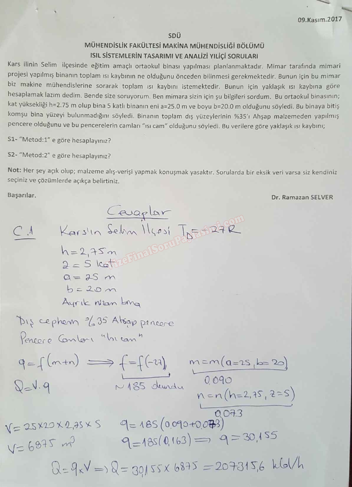 Vize ve Final Soruları / Süleyman Demirel Üniversitesi / Isıl Sistemlerin Tasarımı ve Analizi