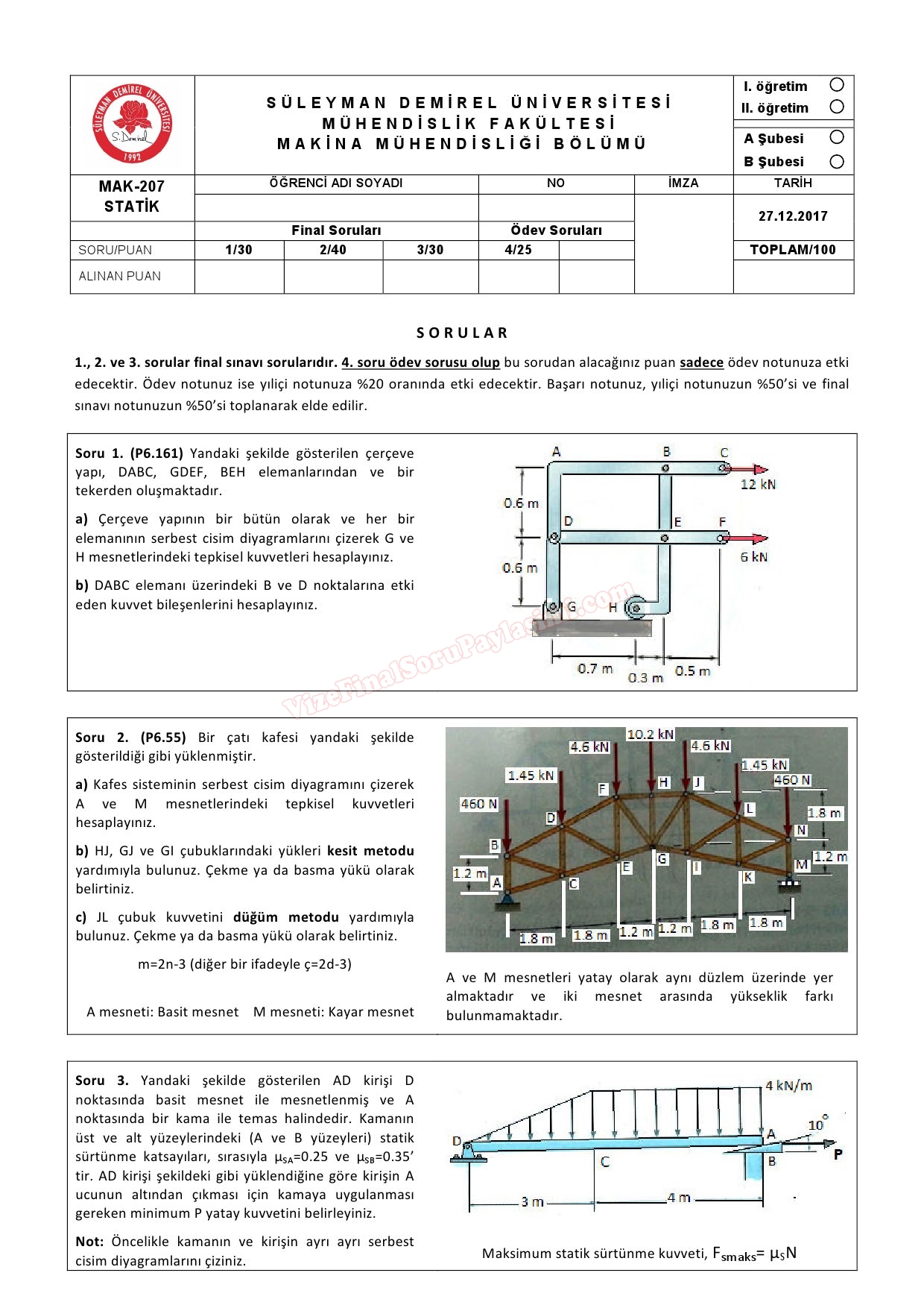 sdu Süleyman Demirel Üniversitesi Statik Dersi final soruları cevapları GERİ DÖN-