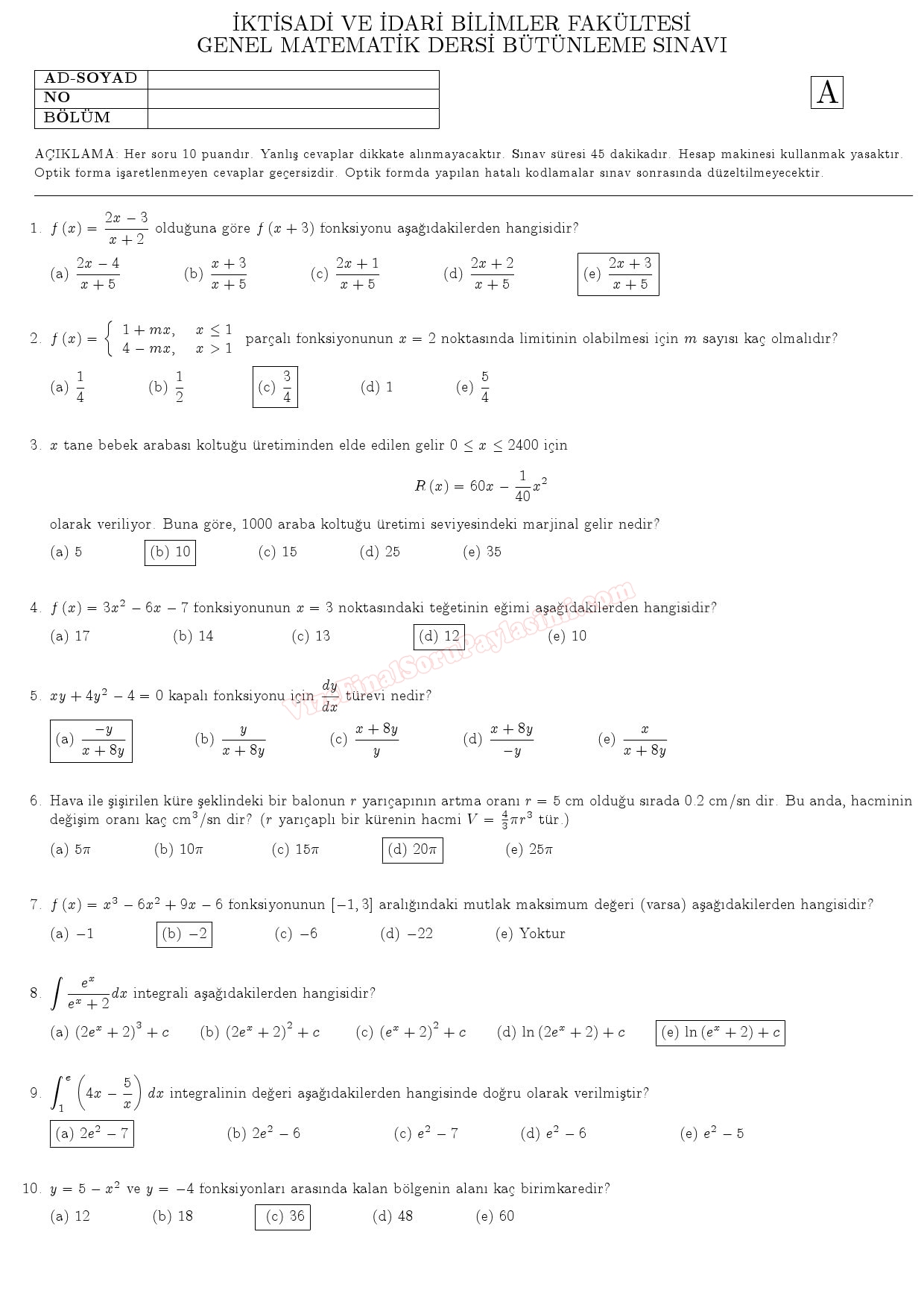 Genel Matematik Dersi Final Soruları ve Cevapları 23-01-2018, 09:42