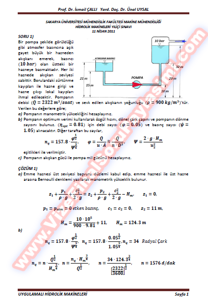 Vize ve Final Soruları / Sakarya Üniversitesi / Hidrolik Makinaları Dersi