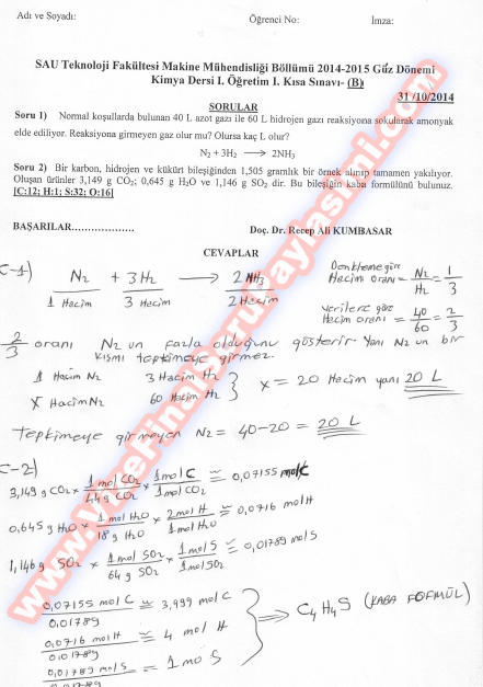 Kimya Vize Soruları Ve Cevapları - 31.10.2014