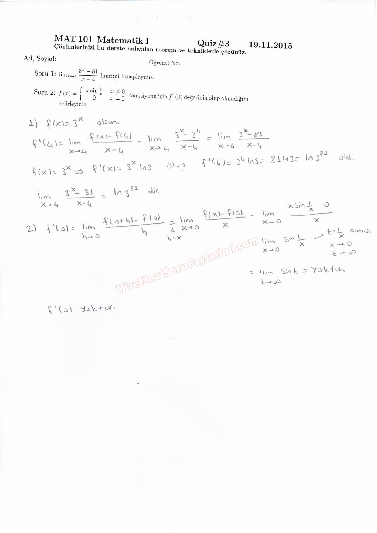 Matematik -1 Dersi Quiz Soruları ve Çözümleri 3-04-2018, 22:09