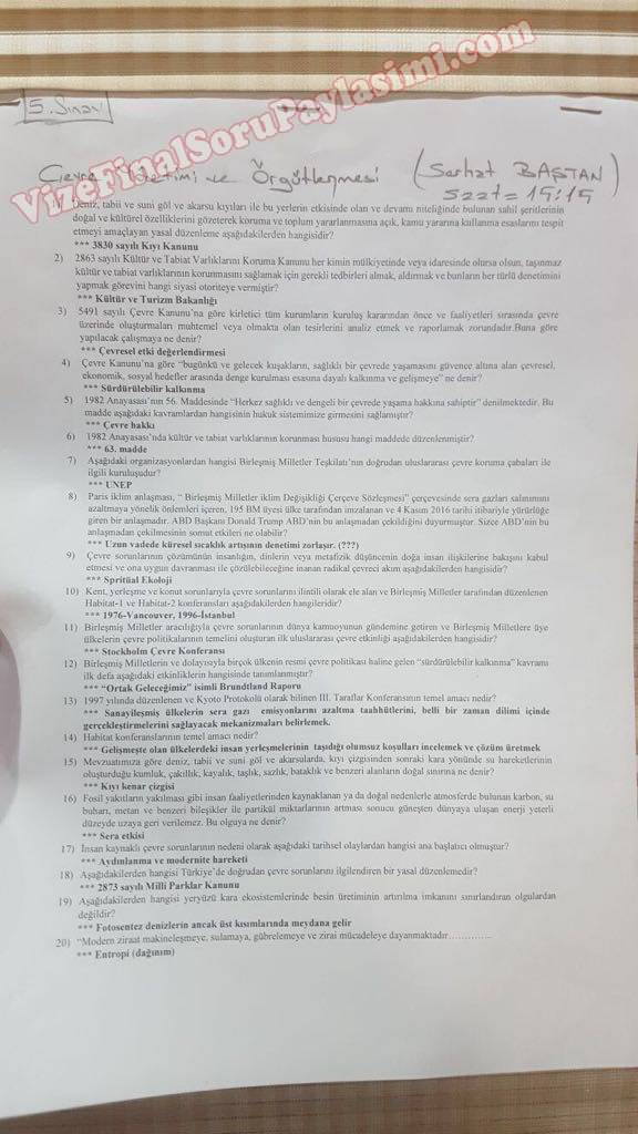 Vize ve Final Soruları / Celal Bayar Üniversitesi / Çevre Yönetimi ve Örgütlenmesi