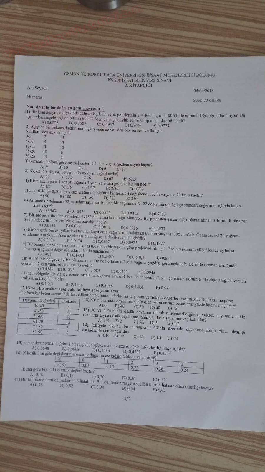 Vize ve Final Soruları / Sakarya Üniversitesi / istatislik-2