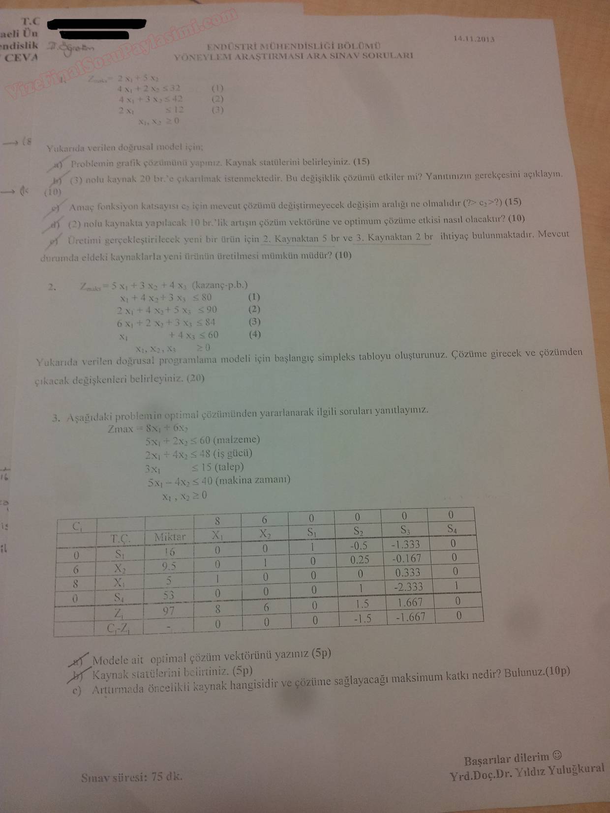 Yöneylem Araştırması Vize Soruları 7-07-2015, 15:00