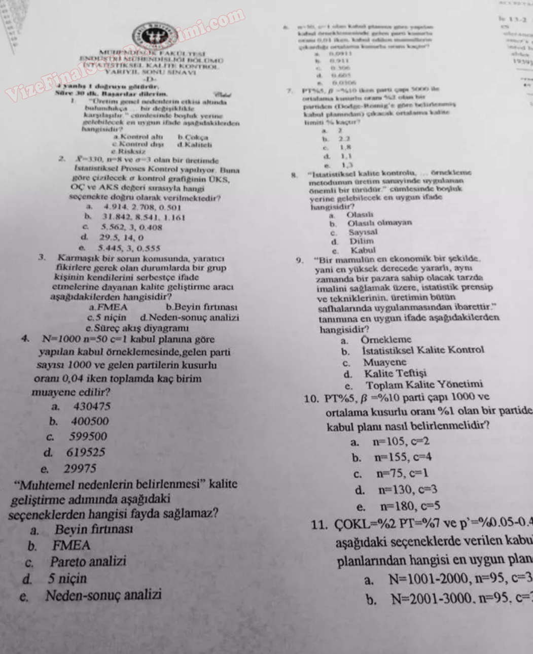 Vize ve Final Soruları / Kocaeli Üniversitesi / İstatistiksel Kalite Kontrol Dersi