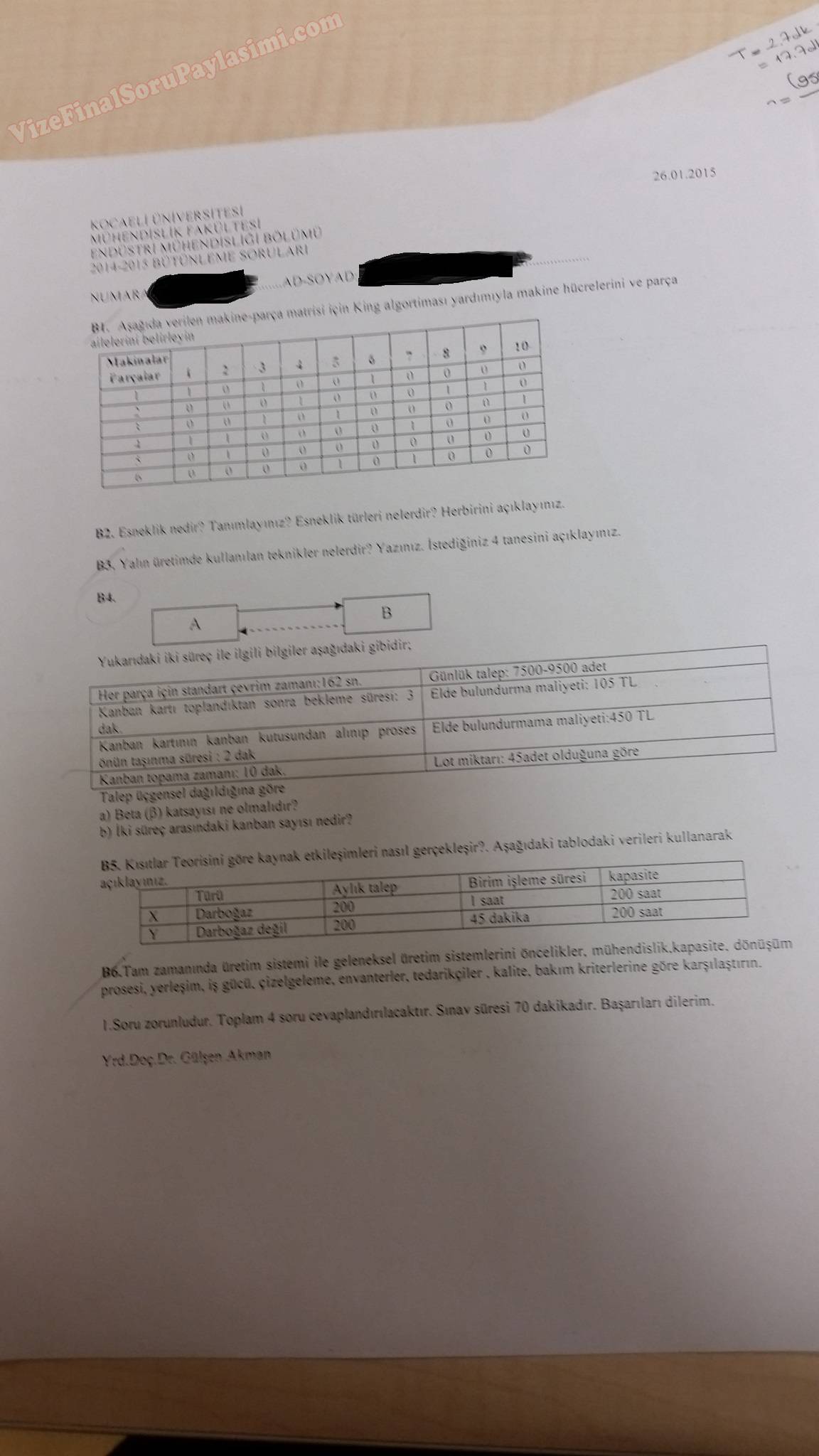 Vize ve Final Soruları / Kocaeli Üniversitesi / Üretim Sistemleri Dersi