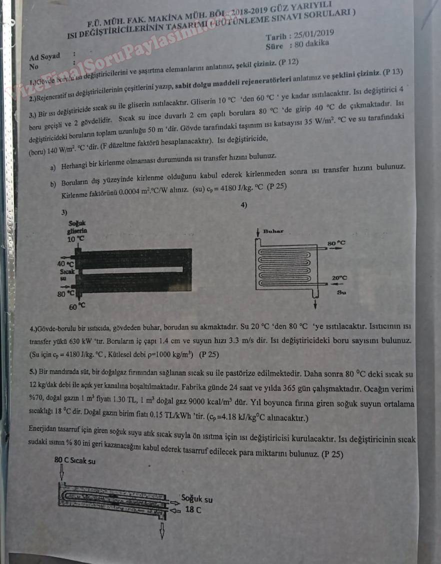 Vize ve Final Soruları / Fırat Üniversitesi / Isı Değiştiricilerinin Tasarımı
