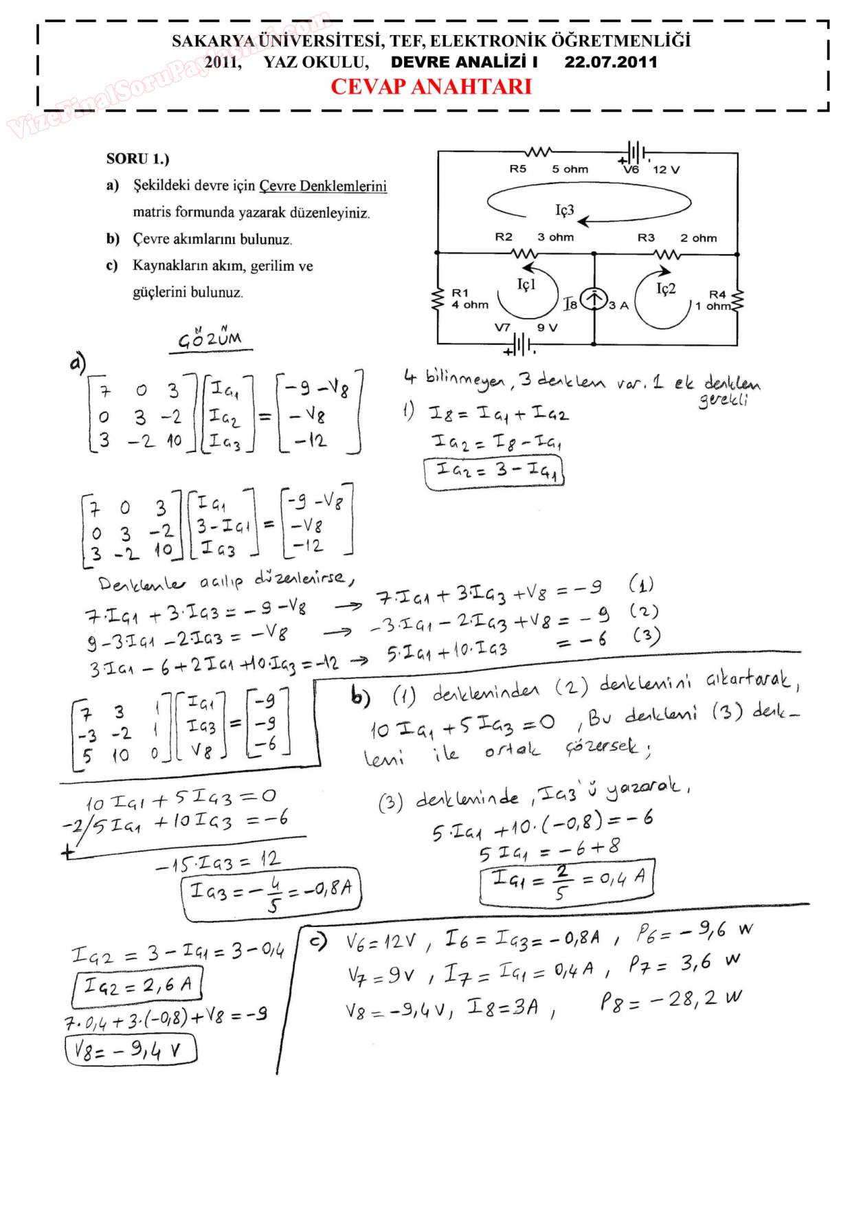 Vize ve Final Soruları / Sakarya Üniversitesi / Elektrik Devreleri-1