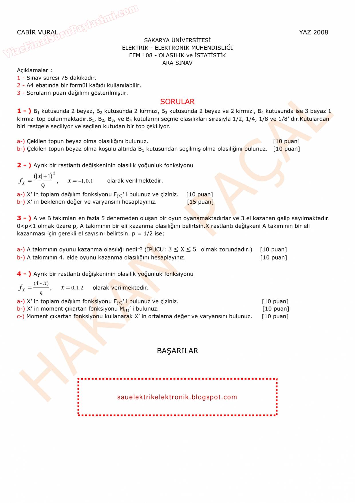 Olasılık ve İstatistik Vize Soruları 28-11-2016, 16:00